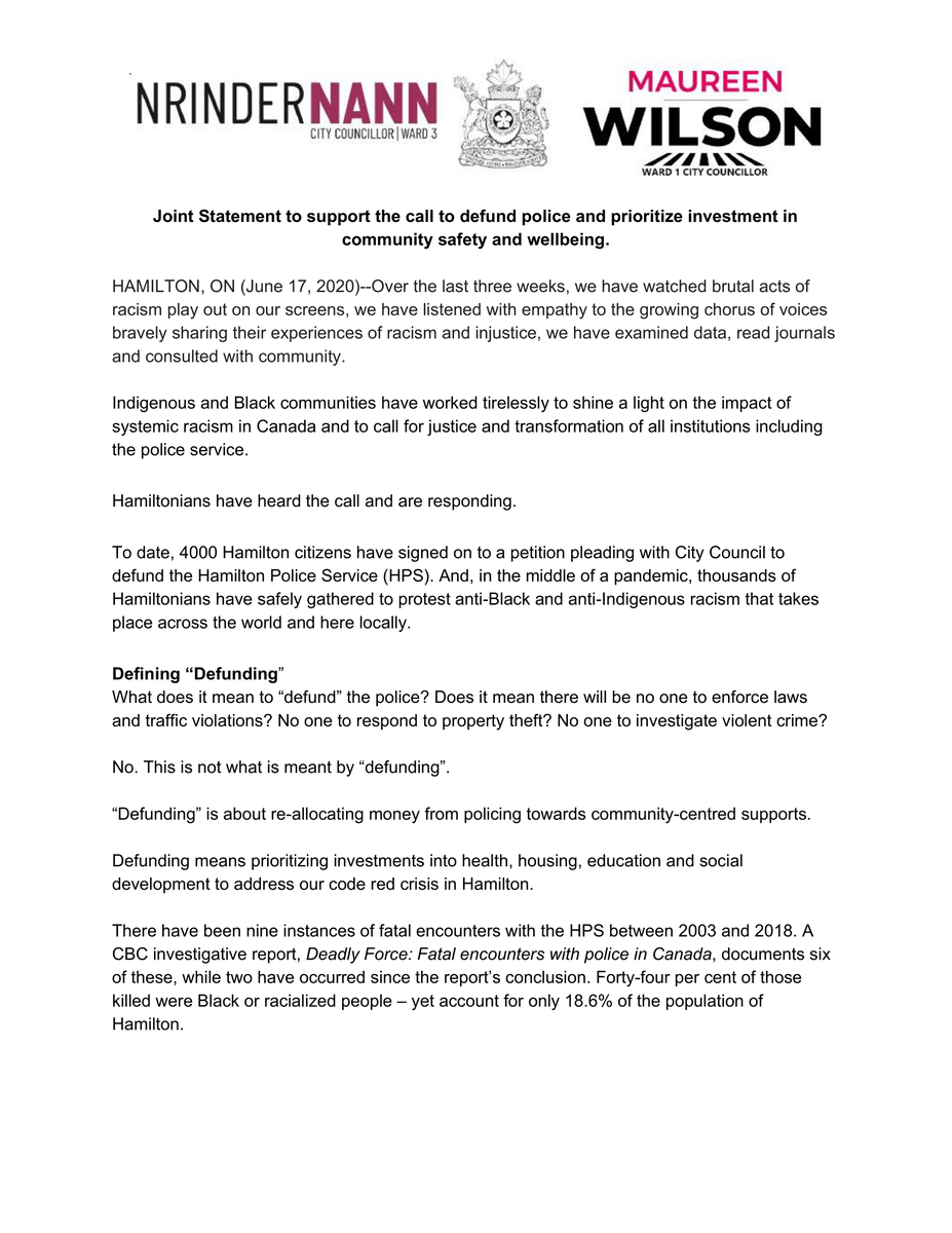 Maureen Wilson She Her On Twitter Full Text Of My Joint Statement With Councillor Nrinderward3 Calling To Defund Police Reallocate Investment In Community Https T Co 6ni9tl82me Https T Co Tggv4qmk2d